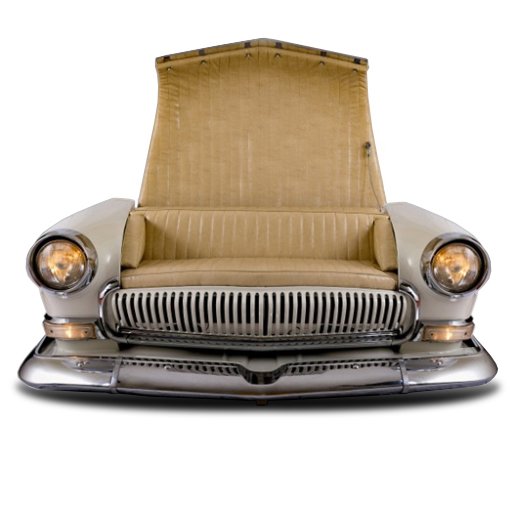 Диван, выполненный из задней части автомобиля ГАЗ-21 III Серии. Цвет - слоновая кость, материал дивана- глянцевая экокожа. Свет работает от сети 220В. Корпус-металлический. Капот открывается.